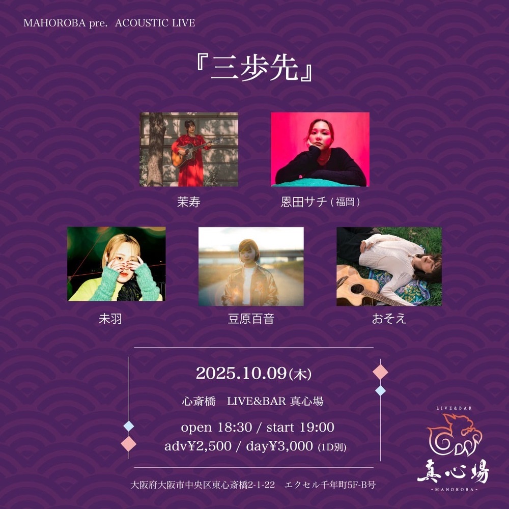 三歩先 SCHEDULE 2025/10/09(木) 真心場 OPEN 18:30 / START 19:00 ADV. ¥2500 / DOOR. ¥3000(+1D) 2番手19:35から URLをコピーする 報告する