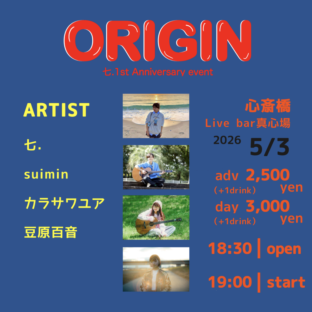 七.1st Anniversary event「ORIGIN」 SCHEDULE 2026/05/03(日) 真心場 OPEN 18:30 / START 19:00 ADV. ¥2500 / DOOR. ¥3000(+1D) URLをコピーする 報告する