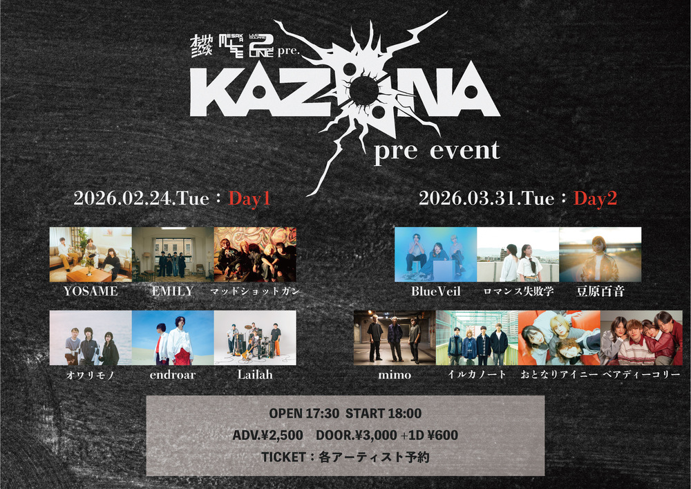 KAZAANA pre event Day2 SCHEDULE 2026/03/31(火) LIVE SQUARE 2nd LINE OPEN 17:30 / START 18:00 ADV. ¥2500 / DOOR. ¥3000(+1D) URLをコピーする 報告する